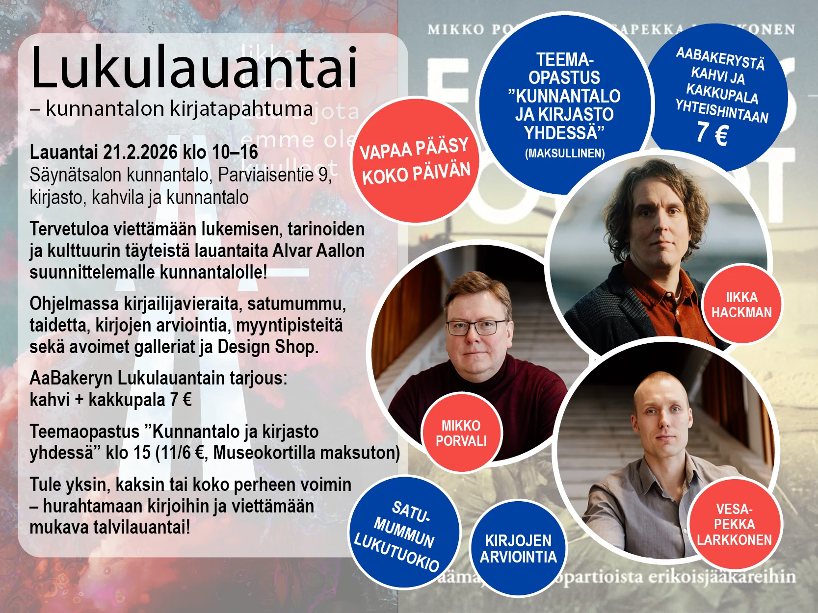 Tervetuloa viettämään lukemisen, tarinoiden ja kulttuurin täyteistä lauantaita Alvar Aallon suunnittelemalle kunnantalolle!